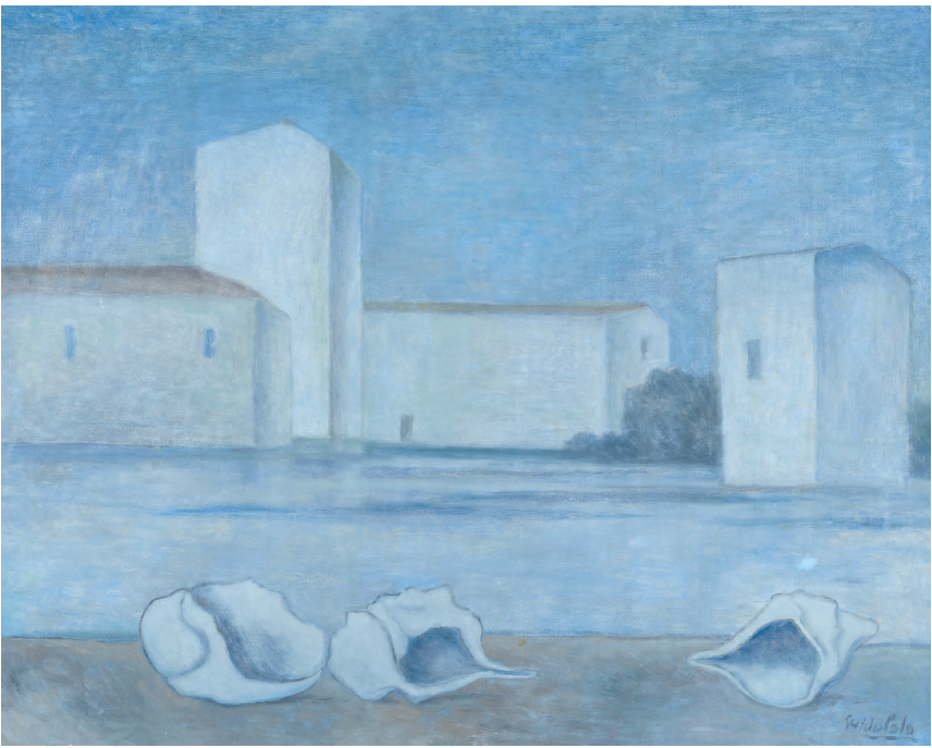 Sospensione spazio-temporale: Pennellate libere e toni irreali (come in Tre Conchiglie in laguna, 1968).